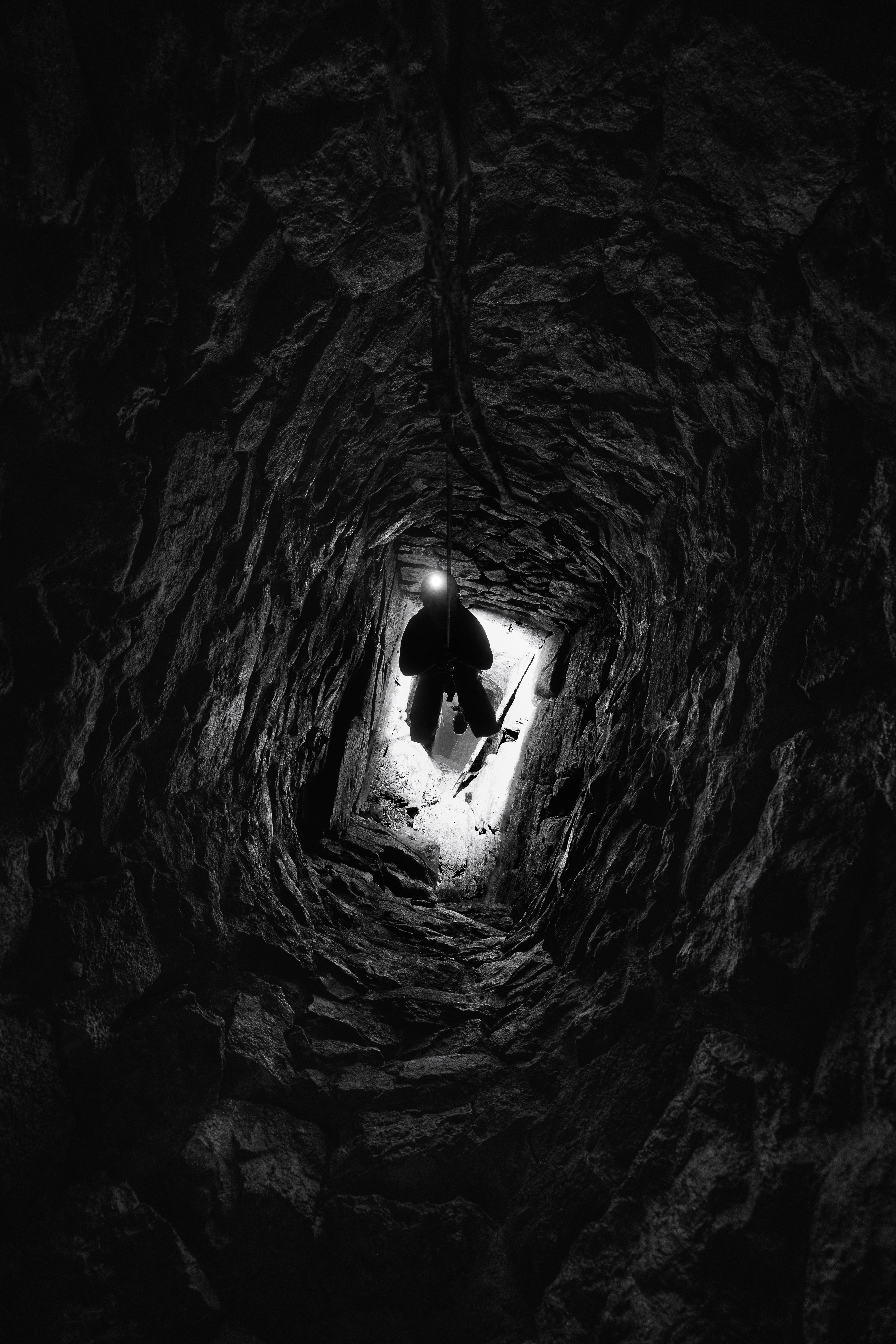 Intake dale mine is something I have only seen from the surface. It's quite a sight and has one of the best lids for any cave/mine in the region. Masterfully fabricated by Portobello Engineering it could be mistaken for a door ripped off the end of a tank. Behind its heavy doors lies a 70m engine shaft where all regions of the mine can be accessed John's mission is to cap a boulder above hobgoblins' way and possibly push a connection up into Brexit rift connected the midlevel mine to the natural bellow. With all other members of our crew feeling the effects of winter in full swing opted to take a weekend away from the usual projects and have some fun showing Intake Dale to the rest of us whom have never had the pleasure. A proposed exchange trip(the first in intake dale) with Rob and John dropping the Engine shaft whiles Luke Sam and myself enter through the higher opencut entrance. Luke leading the pleasant journey down the two pitches both needing care to be taken as Intake is somewhat fragile to put it delicately. Once off the rope we reach a junction at a drafty vein. The way down leads to mineworking’s with a much worthwhile chamber past Brexit rift. This is our first stop. Free climbing down we reach the scaffold choke dubbed Brexit rift. The route on is completely hidden blending in with the boulders and odd scaffold. A tight crawl where a haste is rewarded with threaded steel smashed in your shoulder. On the other side a small natural chamber that slopes to the lower level. Once we are though we all pause to listen for John and Rob. Luke and Sam start to hear movement resembling high heels on the cobbles Jon and rob must be getting adventurous beneath us.
