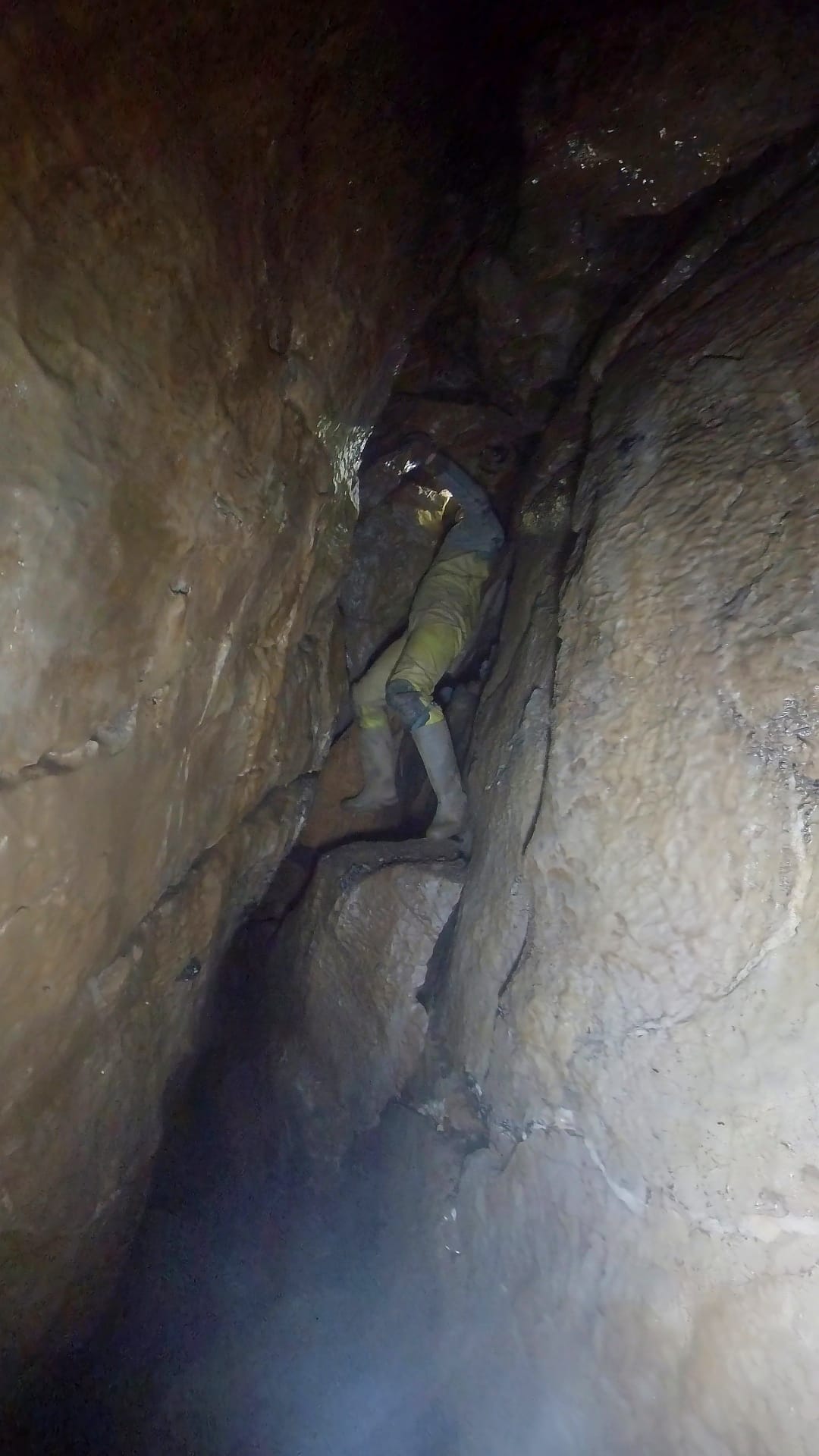 After only a few minutes I could see the black space beyond. Progress was quite tricky because almost everything moved and it was difficult to know whether to cap stuff or try drop it down out of the way. Jon was exceptionally helpful steering from the back. Eventually rocks were moving forwards and down easily and I could finally see clearly see into the void beyond, and it look tasty. In an unusual act of consideration I decided not to go head first, just as well as it turned out to be a 3m drop down into the tall passage heading off. I checked my watch, 57 minutes. 😊