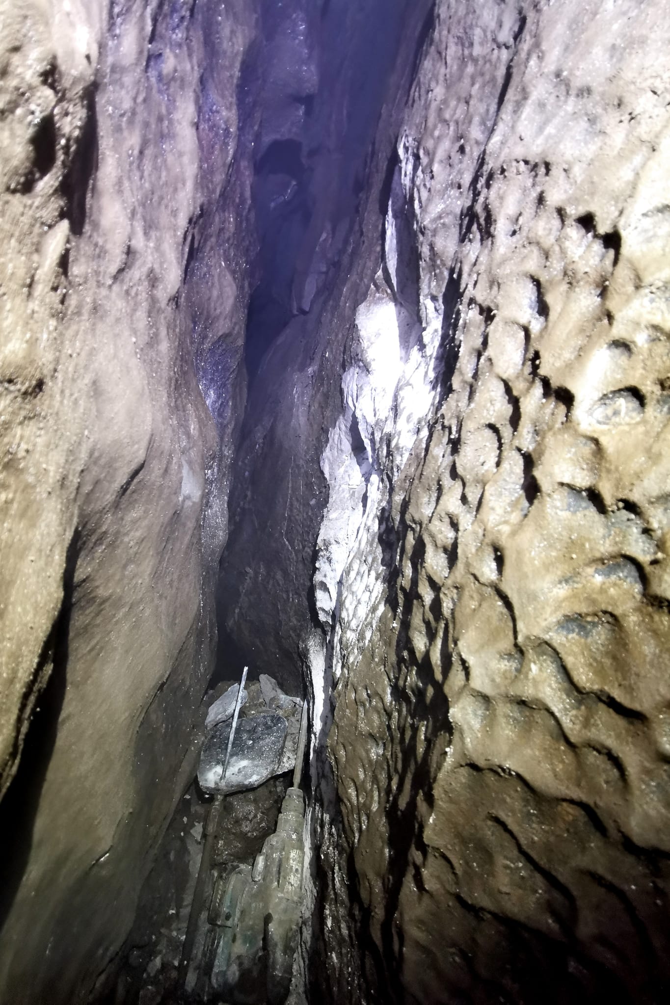 Actuellement on voit bien devant, mais il faut enlever 10 à 15cm par le côté droite pour gagner la suite qui a l'air d'agrandir très bientôt. Heureusement la faille est un peu profonde donc on peut laisser tomber tous que nous creusons sans avoir besoin de les stocker au derrière. C'est très prometteur à mon avis, mais pas le goût de tout le monde !