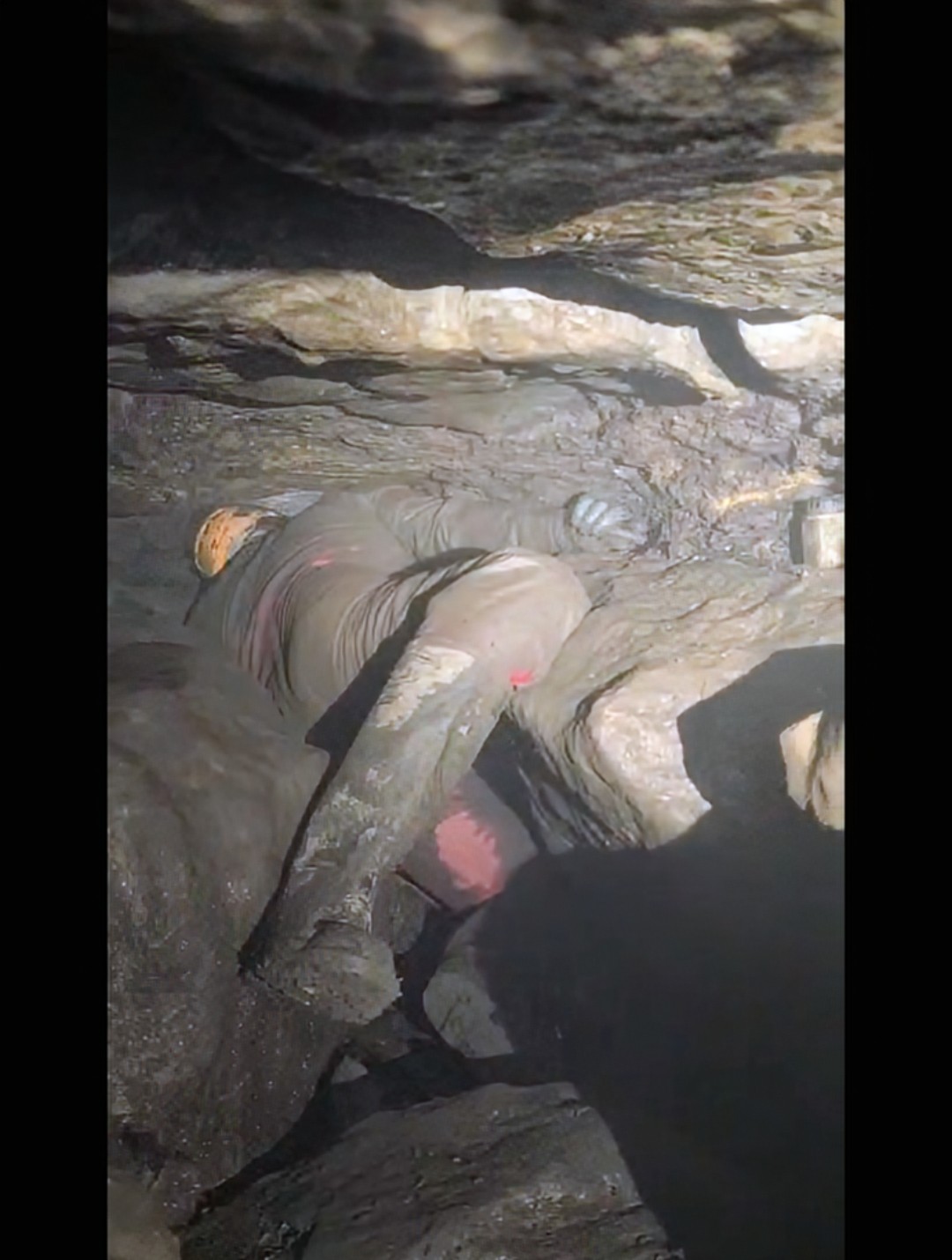 I stepped over the log, and got on my stomach and watch Chris slide off into the distance. Pushing the heavy bag I followed in to a low flat out crawl, head to the side as I couldn’t lift it up it was that low. I love these types of crawls. Arms over head I pushed the bag around a corner and then found a groove in the floor to gain more room. (By more room I mean that I could turn my head) I could see Chris’ light facing me and suddenly this heavy bag was pulled out of my way and I popped up into a small chamber with a pool at the bottom.