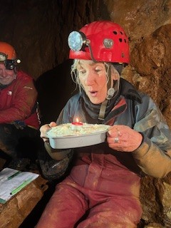Finally, we reached the collapse. Several feet of mud, zero view of the rumored plastic pipe, and the idea that the mud may be moving a bit forward into the passage. But hey — we’d made it! Time for cake diplomacy.